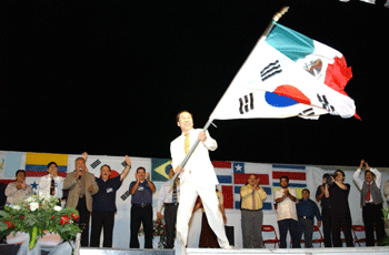 両国旗の伝達式の後、韓国の太国旗とメキシコ国旗を力強く振る牧師