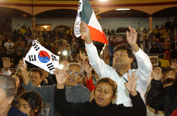 韓国の太国旗とメキシコ国旗を手に持って賛美する聖徒たち。