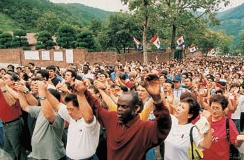 セミナー登録手続きを前にして集まった参加者たちが祈りと賛美をもって準備している。