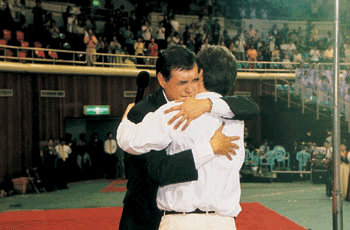 インドネシアのべダニ教団の総会長であるニコ牧師と聖霊によって一つになり感激の抱擁をする総会長牧師