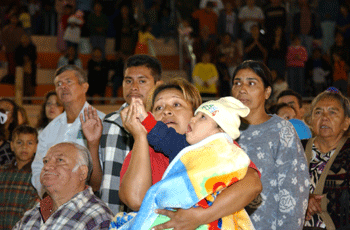 野外集会の肌寒い天気の中でも牧師の説教を一生懸命に傾聴する母と娘